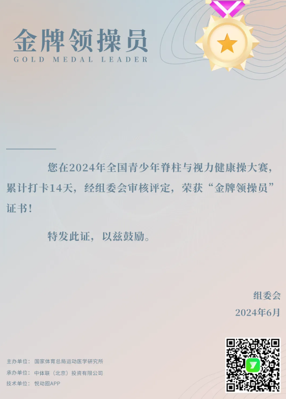 2.累计打卡14日,完成第二阶段比赛,获得由主办方单位颁发的脊柱与视力健康操“金牌领操员”电子荣誉证书。